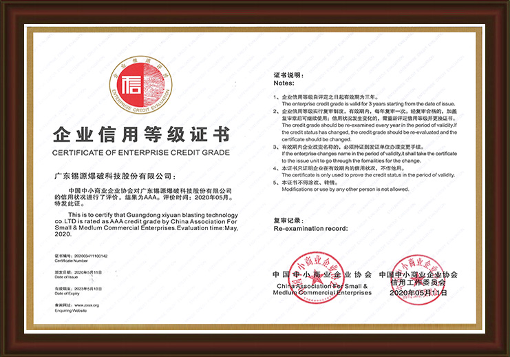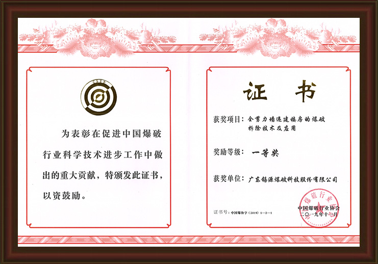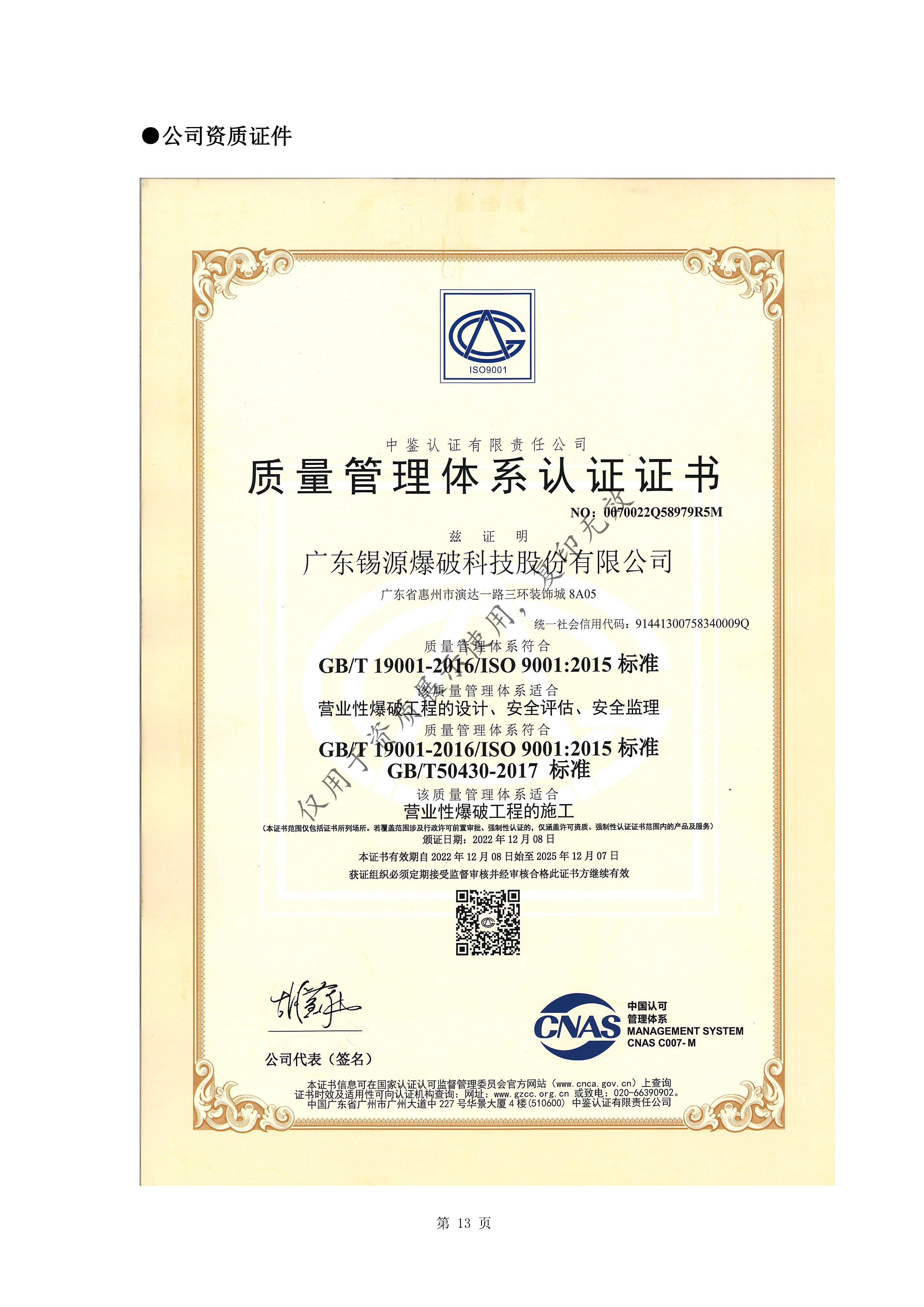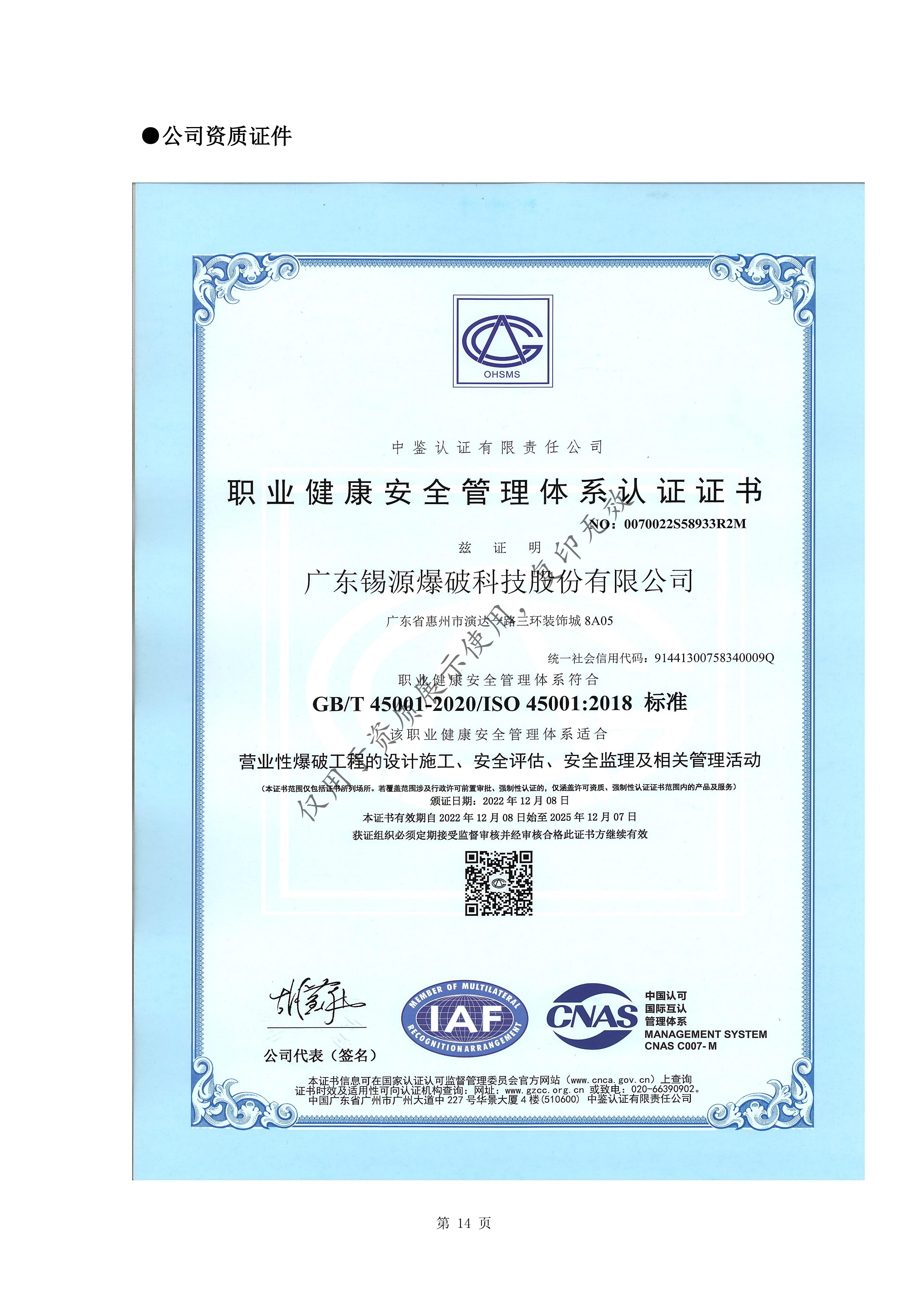 公司致力推進(jìn)管理體系化、標(biāo)準(zhǔn)化、規(guī)范化、信息化建設(shè),以安全高效、科學(xué)的全過程施工管理、優(yōu)質(zhì)的爆破服務(wù)贏得了社會(huì)各界的贊譽(yù),成為廣東地區(qū)爆破工程領(lǐng)域的標(biāo)桿企業(yè)?,F(xiàn)已通過ISO9001質(zhì)量管理體系、ISO14001環(huán)境管理體系、ISO45001職業(yè)健康安全管理體系、GB/T50430工程建設(shè)施工企業(yè)質(zhì)量管理等體系認(rèn)證。