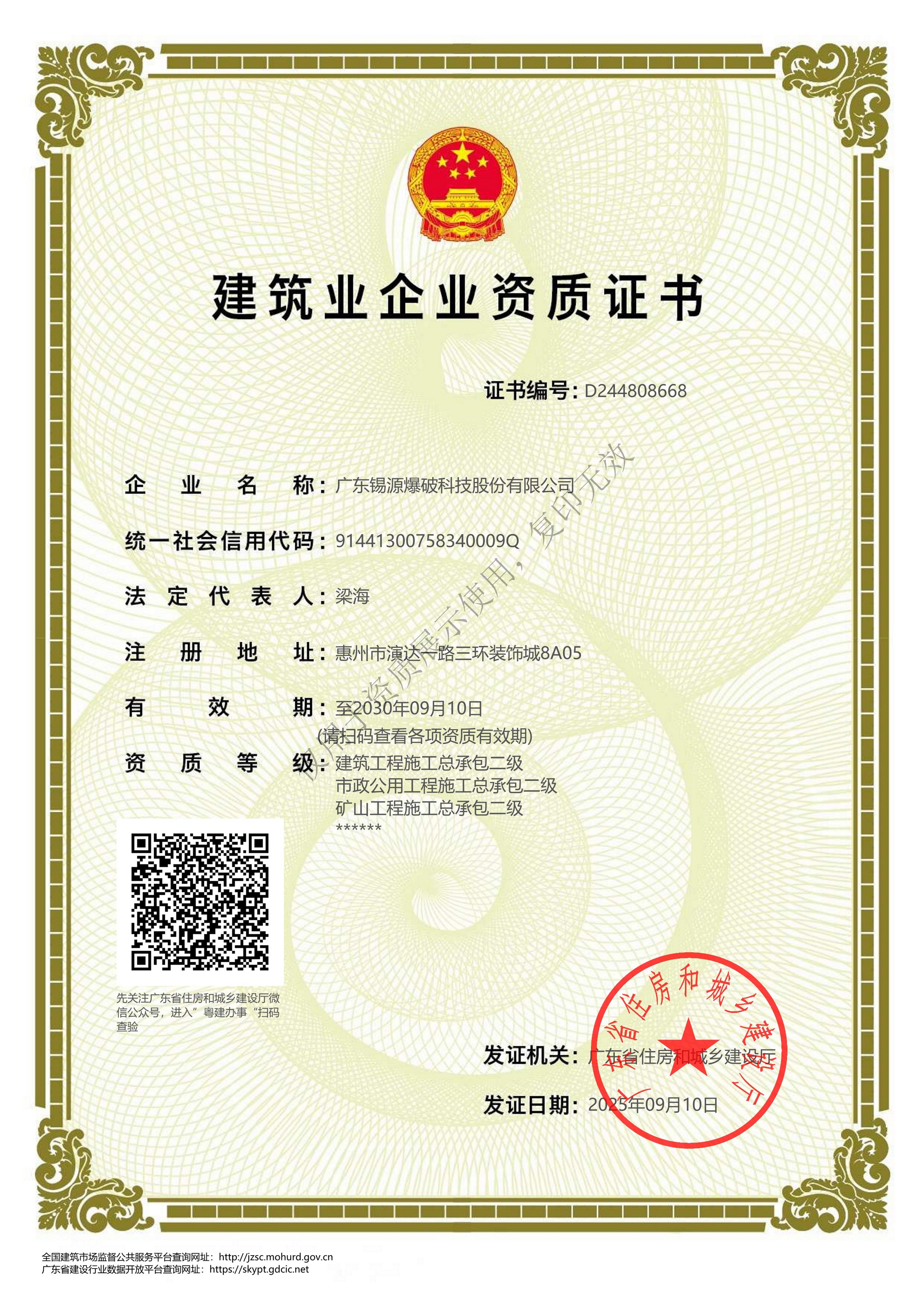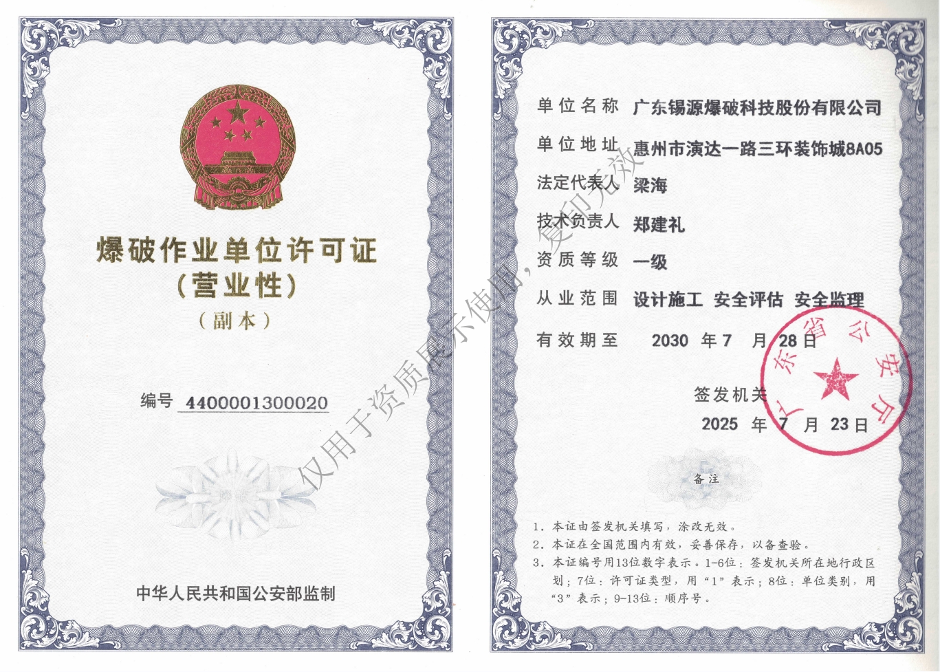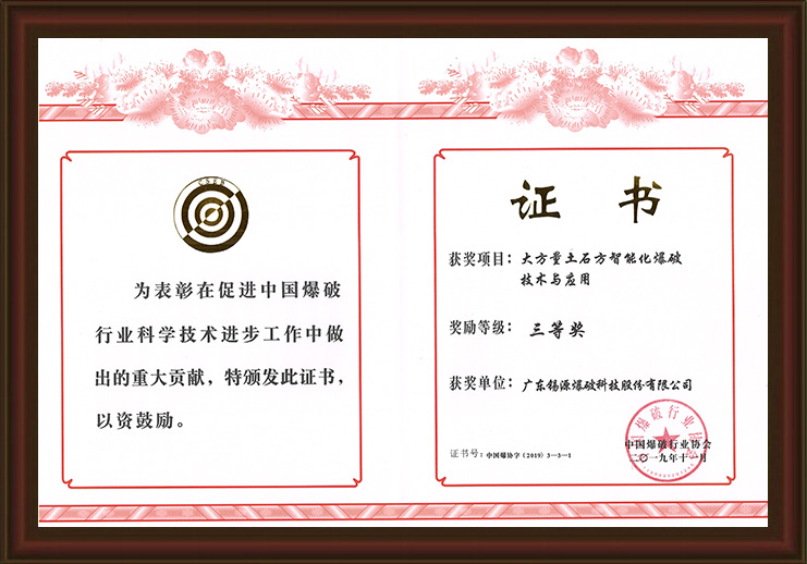 公司實(shí)力雄厚,技術(shù)扎實(shí),獲評(píng)為國家高新技術(shù)企業(yè)、國家商務(wù)部AAA級(jí)信用企業(yè),為首批獲得廣東省公安廳核發(fā)的國家一級(jí)爆破作業(yè)資質(zhì)的企業(yè),擁有市政公用工程、建筑工程、礦山工程總承包,以及地基基礎(chǔ)工程專業(yè)承包等資質(zhì)。在人才培育方面,重視中高端技術(shù)與管理人才的“內(nèi)培外引”,人才培育是放在戰(zhàn)略高度的。公司相繼與清華大學(xué)、安徽理工大學(xué)、東華理工大學(xué)、南華大學(xué)、廣東財(cái)經(jīng)大學(xué)、惠州學(xué)院等國內(nèi)高等院校開展人才交流與合作。發(fā)展至今,公司擁有初/中/高級(jí)爆破工程師以及訓(xùn)練有素的爆破工程技術(shù)團(tuán)隊(duì)近三百人。